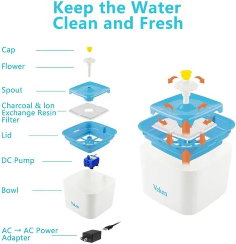 آبخوری فیلتر دار اتوماتیک مخصوص تصفیه و اکسیژنه کردن آب، با طراحی زیبا و ساده که قادر به تامین آب آشامیدنی سالم برای گربه و سگ میباشد. این آبخوری اتوماتیک برند Veken با سیستم فیلتر کننده، ناخالصی ها و املاح غیر ضروری آب را جذب کرده و آب تمیز و سالم را برای گربه و سگ شما فراهم میآورد. ظرف آبخوری اتوماتیک Veken فوق العاده بی صدا و کم مصرف است. ظرفیت این ظرف 2 لیتر است که برای حیوانات خانگی کوچک تا متوسط عالی است. این ظرف آب اتوماتیک فاقد مواد اولیه مضر BPA، بادوام است و کارکردن و تمیز کردن آن نیز آسان است. ظرف آبخوری اتوماتیک حیوانات خانگی Veken دارای 3 حالت آبشار گل، جوشان و فواره ملایم است. هر حالت به طور خاص برای رفع نیازهای حیوانات خانگی مختلف طراحی شده است. فواره گل و رنگ روشن این محصول حیوانات خانگی را جذب می کند.